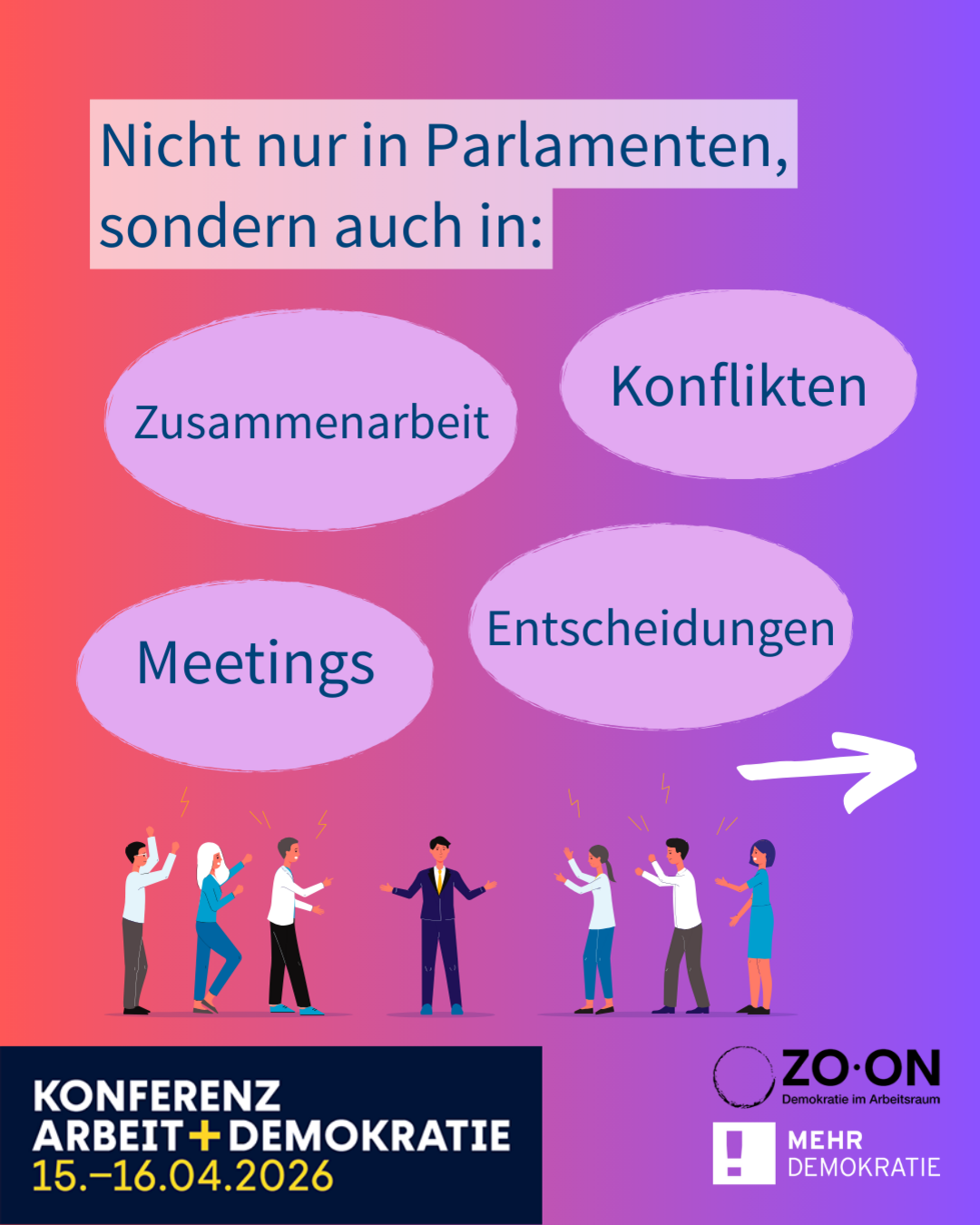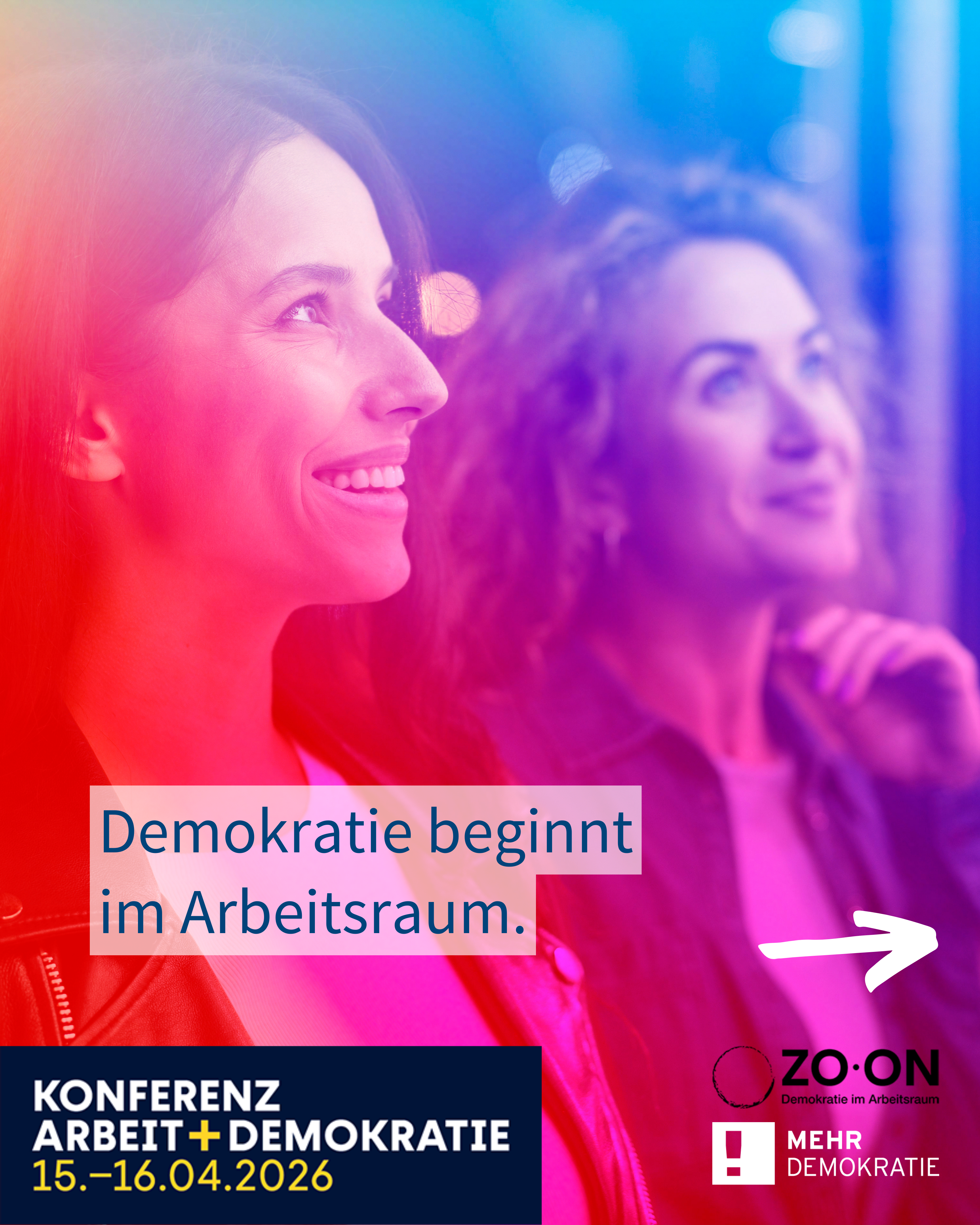 Jeden Tag treffen wir auf der Arbeit Entscheidungen, lösen Konflikte, gestalten Zukunft. Doch selten sehen wir diesen Ort als einen Platz, an dem die Demokratie lebt. Was wir konkret im Arbeitsraum unternehmen können, um unsere Demokratie zu stärken, möchten wir auf unserer Konferenz „Arbeit + Demokratie“ am 15. und 16. April 2026 in Frankfurt am Main klären. Treffen Sie 300 Menschen aus Wirtschaft, Wissenschaft, Politik und Zivilgesellschaft. Erleben Sie, wie Mitgestaltung, Teilhabe und Dialog Zukunft formen – im Team, im Unternehmen, in der Gesellschaft.