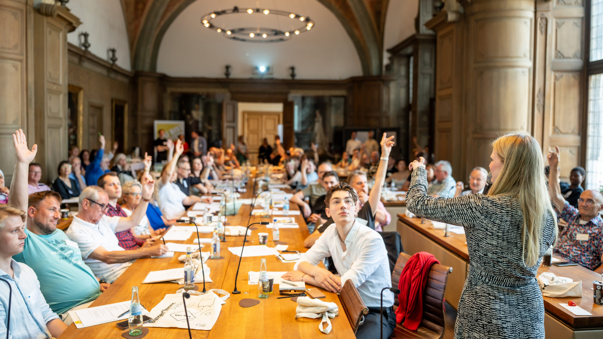 Beim 3. Aachener Bürgerrat kam die Methode des Konsensierens zum Einsatz. Ziel war nicht die perfekte Einigkeit, sondern tragfähige Empfehlungen mit möglichst breiter Zustimmung. Und sichtbarer Offenheit für Kritik. Alle Teilnehmerinnen und Teilnehmer konnten ihre Haltung zu jeder Empfehlung mit Farbkarten kennzeichnen: