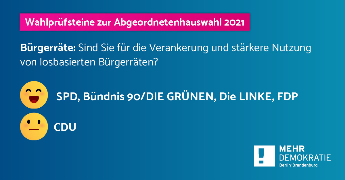 Mehr Informationen:Demokratie-Wahlprüfsteine zur Abgeordnetenhauswahl am 26. September 2021 in Berlin