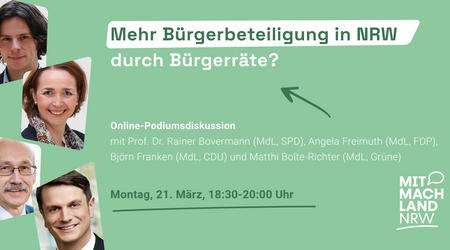Vor der Landtagswahl in Nordrhein-Westfalen am 15. Mai 2022 sprechen sich sieben auf dem Stimmzettel stehende Parteien für Bürgerräte zwischen Rhein…