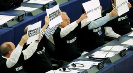 Neun EU-Parlamentarier haben während einer Sitzung am 12. Dezember 2007 ein Referendum über den Reformvertrag gefordert. Sie haben es aber nicht bei Stellungnahme belassen, sondern das "R-Wort" sogar in großen Buchstaben ausgedruckt und hochgehalten: Oh nein, wie böse! Jetzt wurden Sie dafür mit Geldstrafen belegt. Der Präsident des Europäischen Parlaments, Hans-Gert Pöttering, verlangt zwischen 574 und 1435 Euro wegen einer "Störung der Arbeit des Parlaments". Grundlage dafür ist Artikel 147 der Geschäftsordnung, worin steht, dass bei bei außergewöhnlich schwerwiegenden Verstößen gegen die Ordnung oder Störungen der Arbeit des Parlaments Sanktionen verhängt werden können.