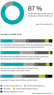 65 Prozent der Befragten sprachen sich in einer repräsentativen Umfrage von infratest dimap für die ARD-Sendung „hart aber fair“ für direkte Abstimmungen über wichtige Fragen zu EU und Euro aus. Im Vergleich zum Jahr 2012 ist das eine Steigerung um 14 Prozentpunkte: Damals wünschten sich 51 Prozent der Deutschen Volksabstimmungen zu wichtigen EU-Fragen. Besonders groß ist der Wunsch nach mehr direkter Demokratie in Ostdeutschland: Dort wünschen sich 75 Prozent Volksentscheide bei europäischen Fragen.