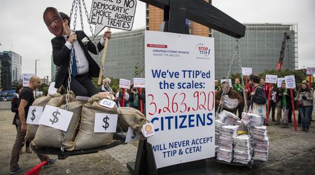 „Stop TTIP“-Aktive aus ganz Europa haben in Brüssel mit einer Aktion vor dem Gebäude der EU-Kommission symbolisch 3.263.920 Unterschriften…