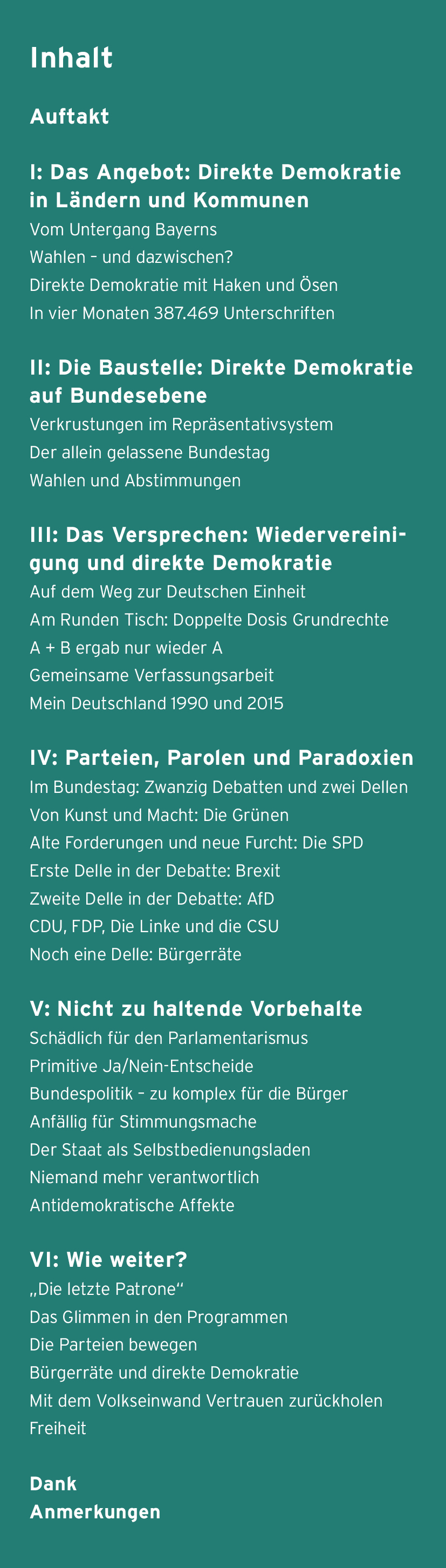 Es ist kein Fach- oder Sachbuch. Ich gehe das Thema aus einer persönlichen Perspektive an und kehre dabei aber immer zu der zentralen Demokratie-Baustelle, zum bundesweiten Volksentscheid zurück. So kann ich von Volksbegehren erzählen, Mut machen, aber auch den Parteien und ihren Phrasen den Spiegel vorhalten. Am persönlichsten dürfte das Kapitel sein, in dem ich beschreibe, wie fremd mir dieses Deutschland war, in das ich nicht geboren, sondern in das ich verwickelt wurde. Ein Kapitel heißt: Mein Deutschland 1990 und 2015.
